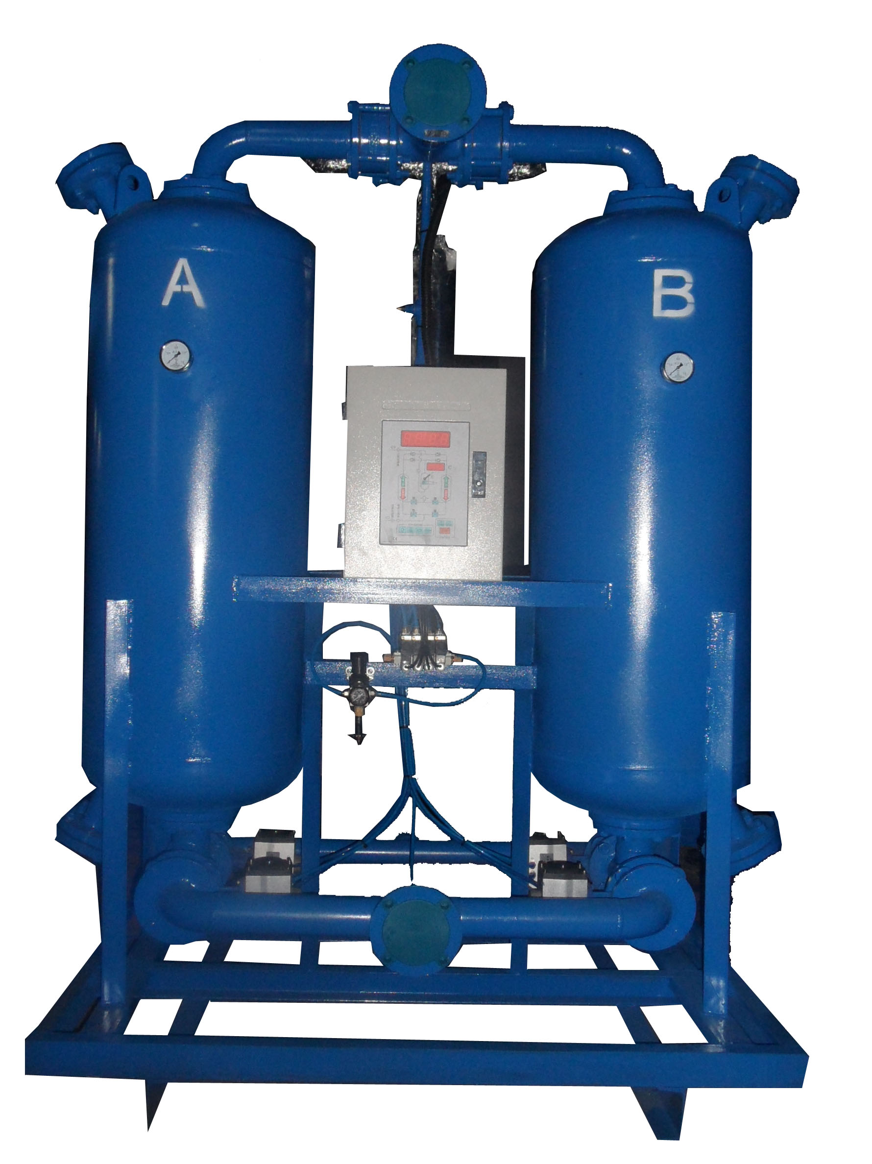 點,利用外部微加熱減少了再生 氣量的損耗,同時也避免了有熱再生干燥機電能消耗大的缺點.。 一個吸附塔在工作壓力 下進行吸附干燥,